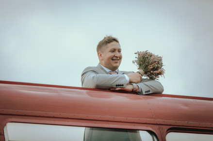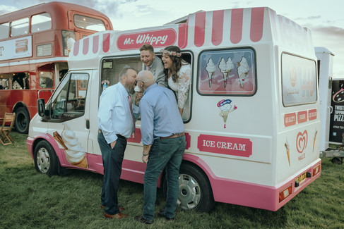 Following a traditional ceremony at St. Bartholomew's Church, the festivities took a lively turn at Punnetts Town Village Hall. The celebration unfolded with The Bus Bar, where guests enjoyed libations in a unique and festive setting. Adding to the joyous atmosphere, an old-fashioned Mr. Whippy ice cream truck rolled in, offering a delightful treat to sweeten the celebration.